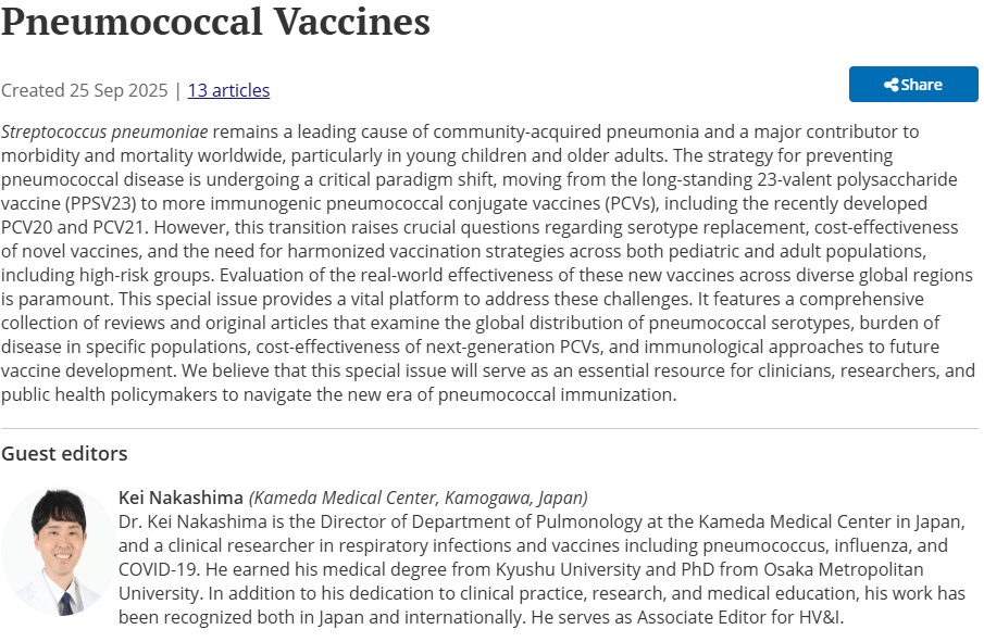 Human Vaccines & Immunotherapeutics にて、当科の主任部長 中島が、Guest Editorを務めた「肺炎球菌ワクチンの新時代」に関する特集号が 公開されました。