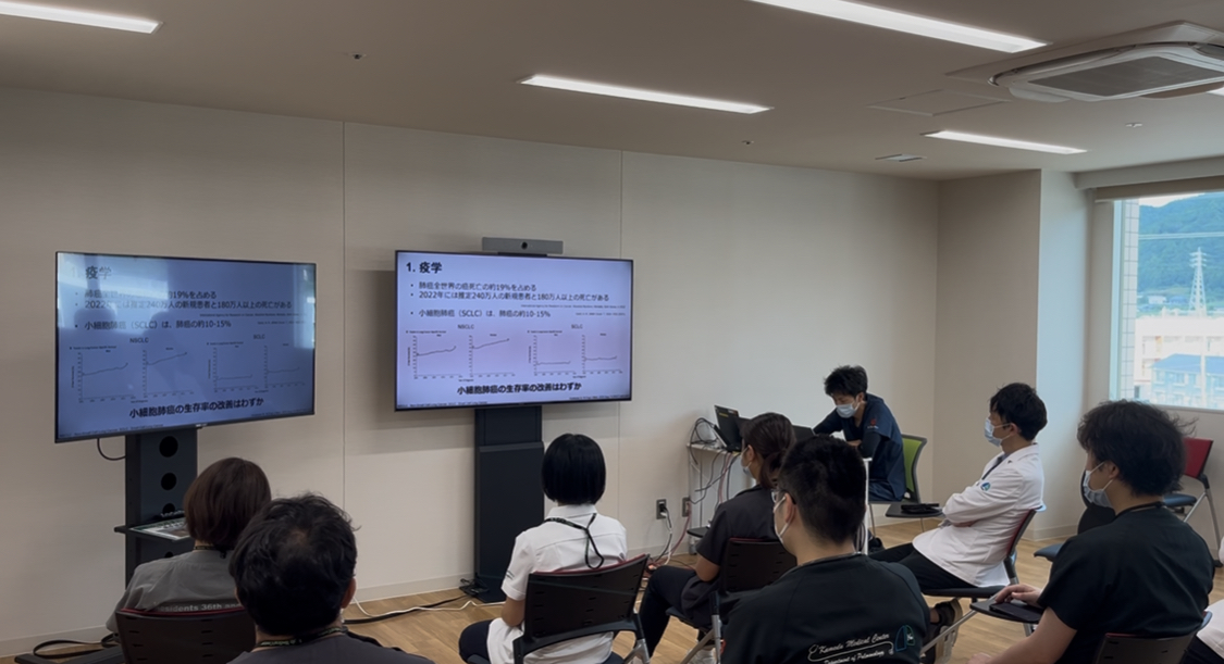 当科では毎週木曜日の朝、各医師が持ち回りで注目領域について抄読会形式のレクチャーを行っています。今回は、当科専攻医の川上博紀先生が「小細胞肺癌Update」と題して、現行標準治療から最新のトピックまでをコンパクトに整理して解説しました。