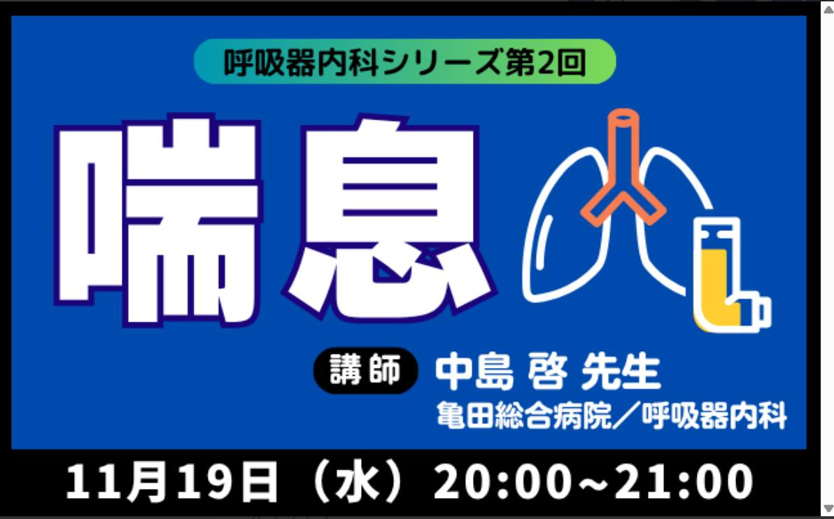 民間医局コネクトセミナーで、当科の中島主任部長が、喘息のオンラインレクチャーを行います。