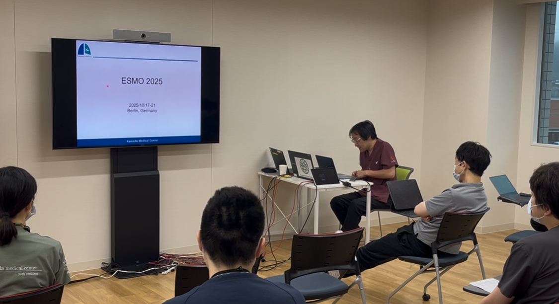 当科では毎週木曜日の朝、各医師が持ち回りで注目領域について抄読会形式のレクチャーを行っています。今回は、当科部長の大槻歩先生が現地参加されたESMO2025において注目した話題について発表しました。