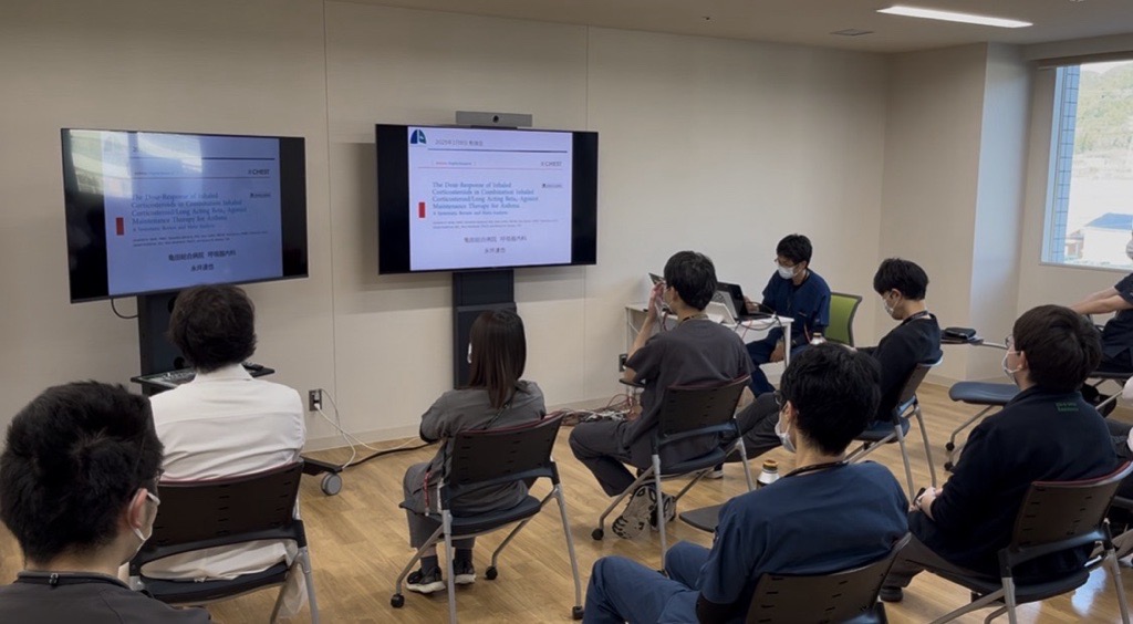当科では毎週木曜日の朝、各医師が持ち回りで注目領域について抄読会形式のレクチャーを行っています。 今回は、当科部長代理の永井先生が、喘息治療の中核である ICS/LABAの「用量設定(低用量〜高用量)」 をテーマに発表しました。