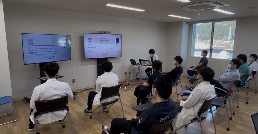 当科では毎週木曜日の朝、各医師が持ち回りで注目領域について抄読会形式のレクチャーを行っています。今回は、当科専攻医の山路創一郎先生が、気胸におけるクランプテストをテーマに発表しました。