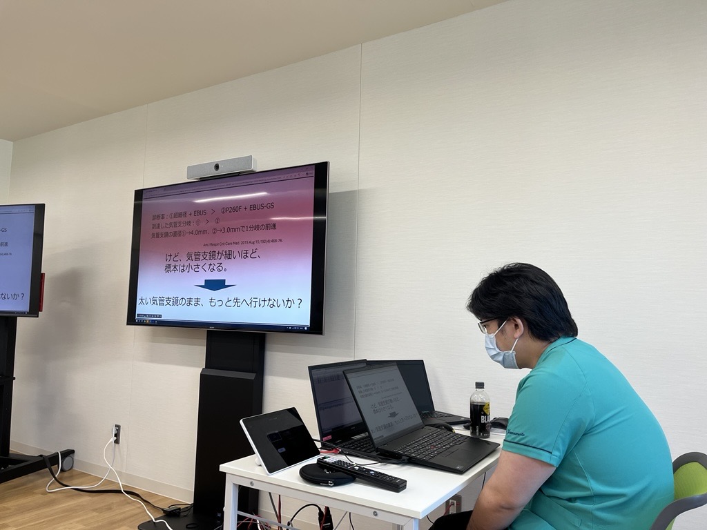 当科では毎週木曜日の朝、各医師が持ち回りで注目領域について抄読会形式のレクチャーを行っています。今回は、当科医長の山本先生が「気管支鏡をより深くへ」というタイトルで発表しました。