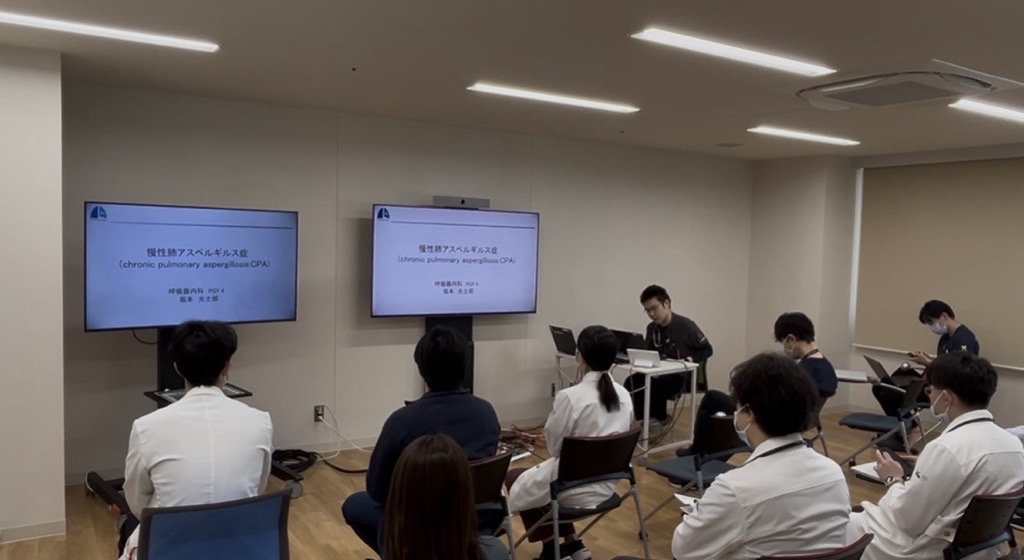 当科では毎週木曜日の朝、各医師が持ち回りで注目領域について抄読会形式のレクチャーを行っています。今回は、肺アスペルギルス症の臨床研究に取り組んでいる当科専攻医の坂本光士郎先生が、肺アスペルギルス症をテーマに発表しました。