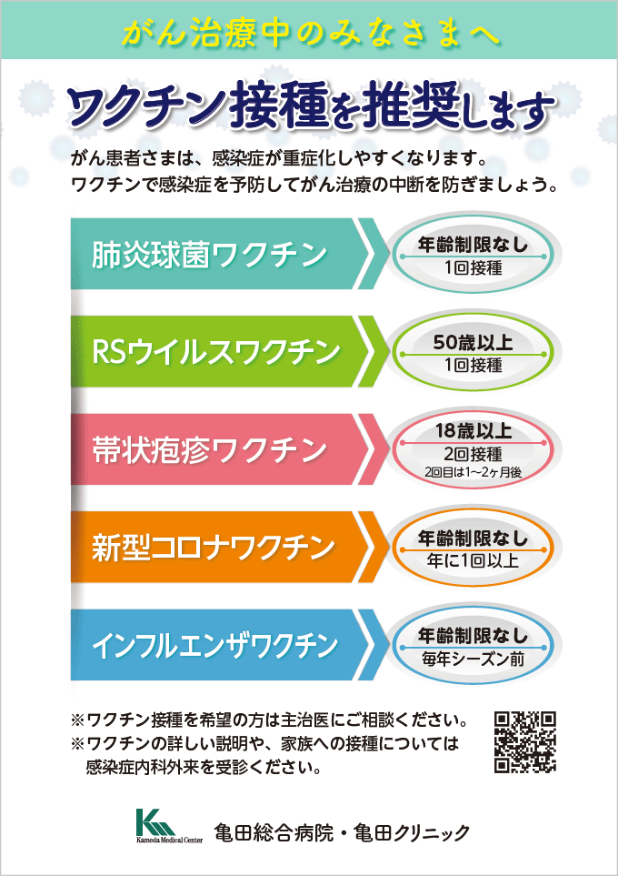 がん患者さまは、感染症が重症化しやすくなります。ワクチンで感染症を予防してがん治療の中断を防ぎましょう。