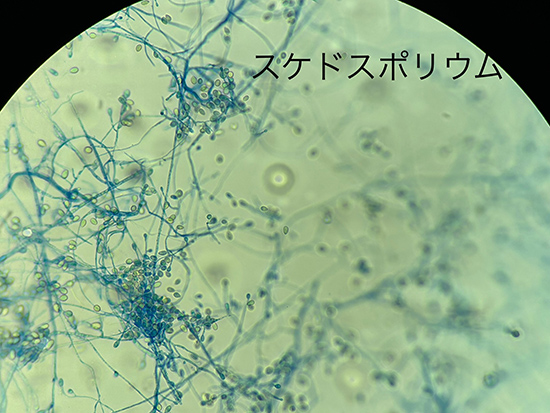 ・Scedosporium属の形態学的特徴として、コロニーは白色や灰色、褐色の綿毛(フェルト)状の集落を形成する。菌糸幅は 2~5 μm とAspergillusの菌糸より細く、有隔壁で菌糸先端や側方には1~2個の卵円型の分生子を形成する。コロニーの発育速度や色調、性状による肉眼的な観察と、スライドカルチャー法での顕微鏡による形態から、属レベルまでは通常の細菌培養が行える施設でも同定可能である。種レベルの同定には形態学的方法に加えて質量分析法や遺伝子検査が重要となる。遺伝子検査では真菌の菌種同定で使用されるITS領域やβ-tubulin遺伝子などの塩基配列を解析することで同定可能である。(19) (20)
