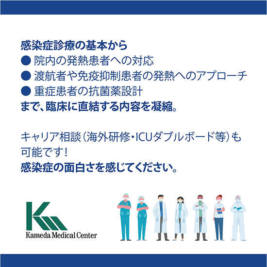 感染症に興味のある研修医・専攻医の先生に向けて、亀田総合病院 感染症内科の指導医・フェローが登壇し、明日からの診療に直結するエッセンスをコンパクトにお届けします。