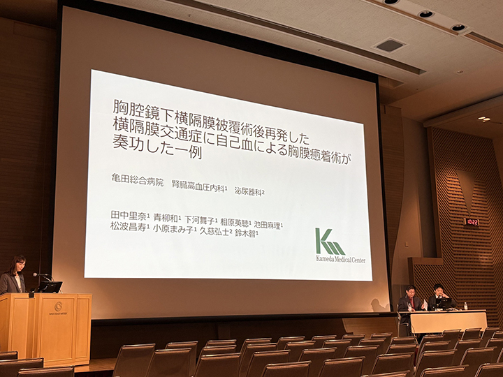 ・専攻医 田中里奈先生「胸腔鏡下横隔膜被覆術後再発した横隔膜交通症に自己血による胸膜癒着術が奏功した1例」