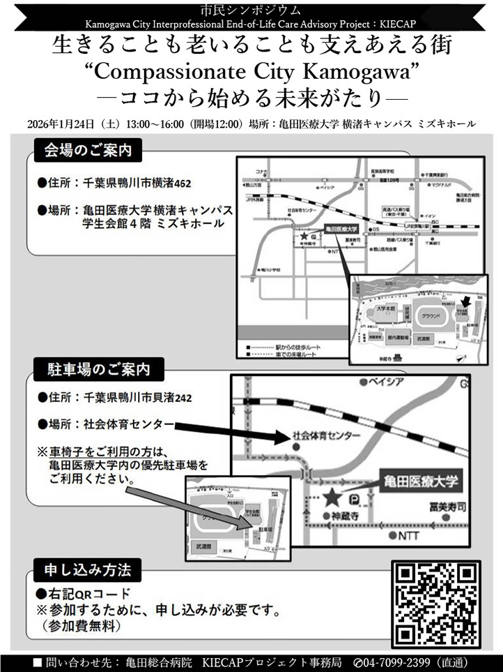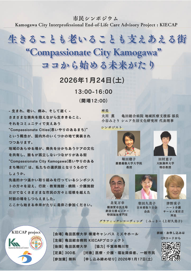 2026年1月24日に亀田医療大学キャンパスミズキホールでKIECAP(Kamogawa City Interprofessional End-of-Life Advisory Project) 主催の市民シンポジウムを開催します。