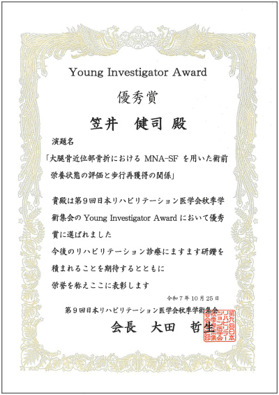 2025年10月23日から25日にかけて、北海道旭川市で行われた、第9回日本リハビリテーション医学会秋季学術集会において、当科スタッフの笠井が Young Investigator Award で優秀賞をいただきました。